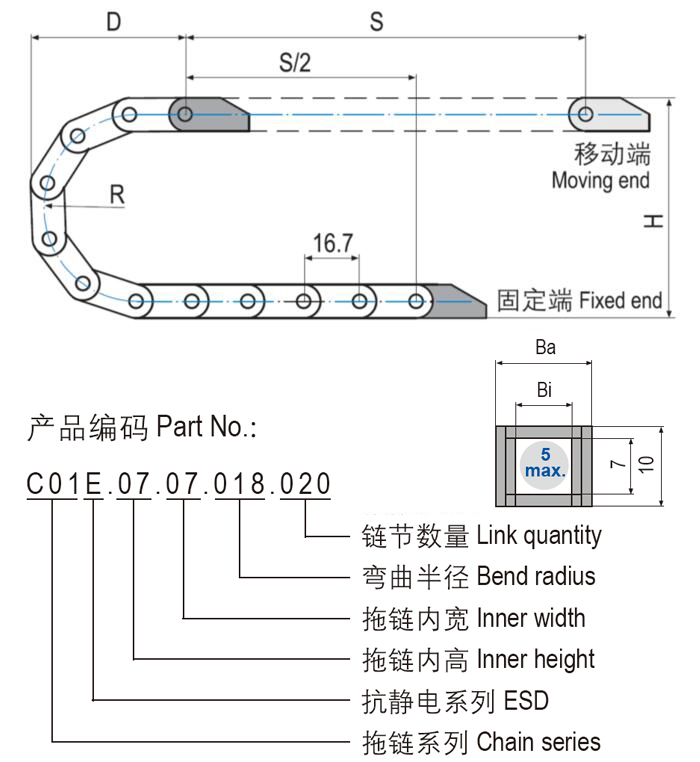 C01E.07抗靜電微型塑料拖鏈體積極小,基于一片式設(shè)計(jì)重量輕特別適用于高速運(yùn)動(dòng)。C01E.07抗靜電微型塑料拖鏈適用于較小安裝空間,多種尺寸規(guī)格可選。