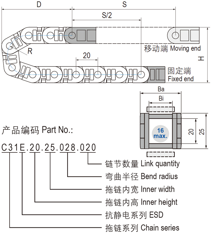 C31E.20抗靜電微型電纜拖鏈可沿內(nèi)側(cè)或外側(cè)打開,堅(jiān)固耐用和多種打開方式設(shè)計(jì),適用于高速運(yùn)動。C31E.20抗靜電微型可打開電纜拖鏈適用于較小安裝空間,多種內(nèi)寬規(guī)格可選。