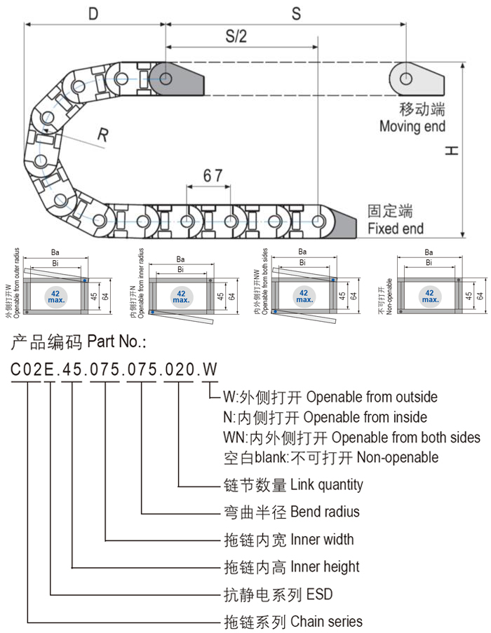 C02E.45抗靜電通用型塑料拖鏈?zhǔn)菓?yīng)用范圍廣泛的產(chǎn)品,簡(jiǎn)單而多功能的組裝結(jié)合堅(jiān)固性,高強(qiáng)度配合更安靜的運(yùn)動(dòng),更長(zhǎng)的電纜壽命和許多安裝選項(xiàng)