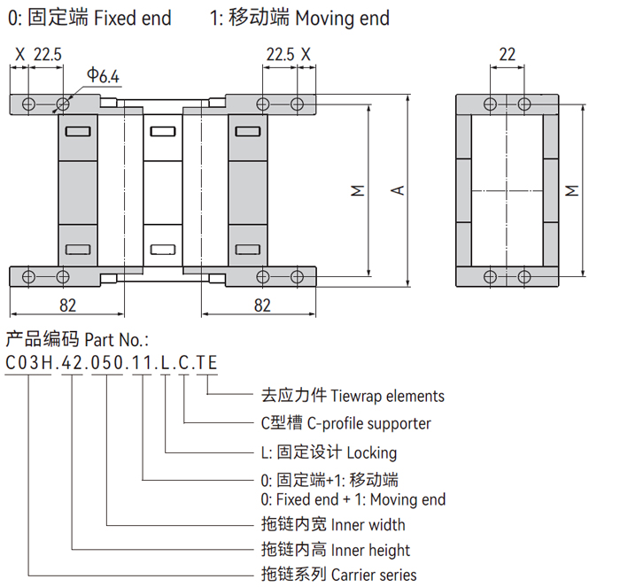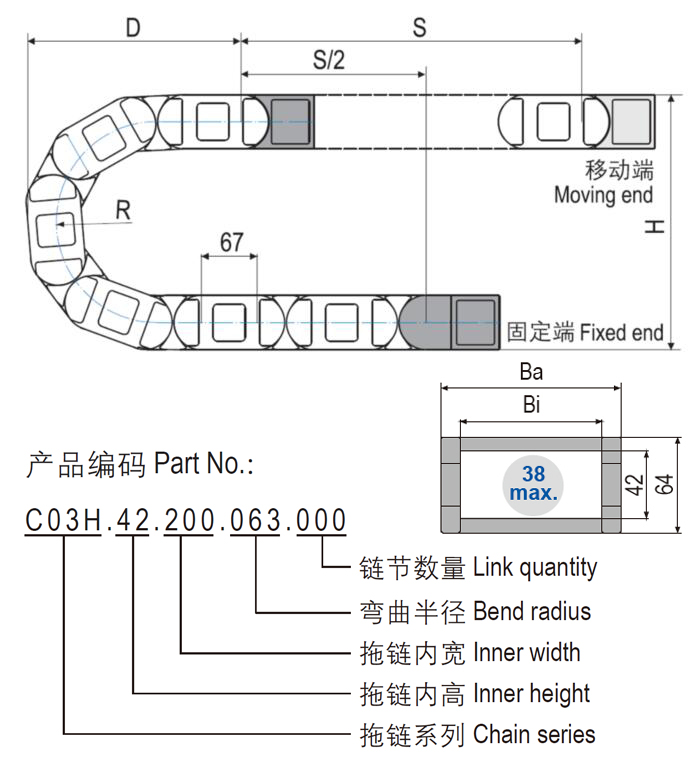 C03H高強度電纜拖鏈?zhǔn)腔贑03電纜拖鏈的改進版本。高強度材料結(jié)合穩(wěn)固的結(jié)構(gòu)設(shè)計使得C03H具有更高的承載能力,特殊橫桿設(shè)計賦予了拖鏈內(nèi)寬尺寸高自由度選擇。