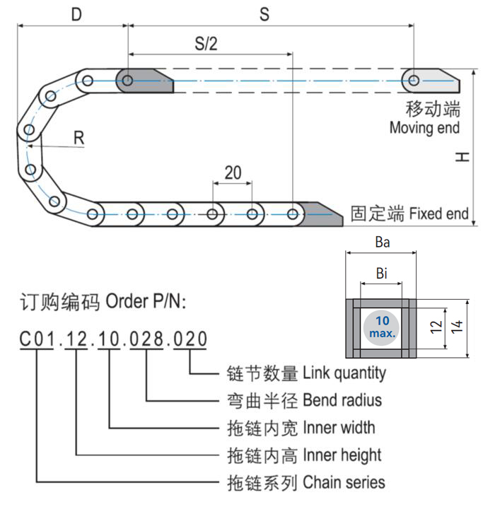 C01.12微型塑料拖鏈體積極小,基于一片式設計重量輕特別適用于高速運動。C01.12微型塑料拖鏈適用于較小安裝空間,多種尺寸規(guī)格可選。