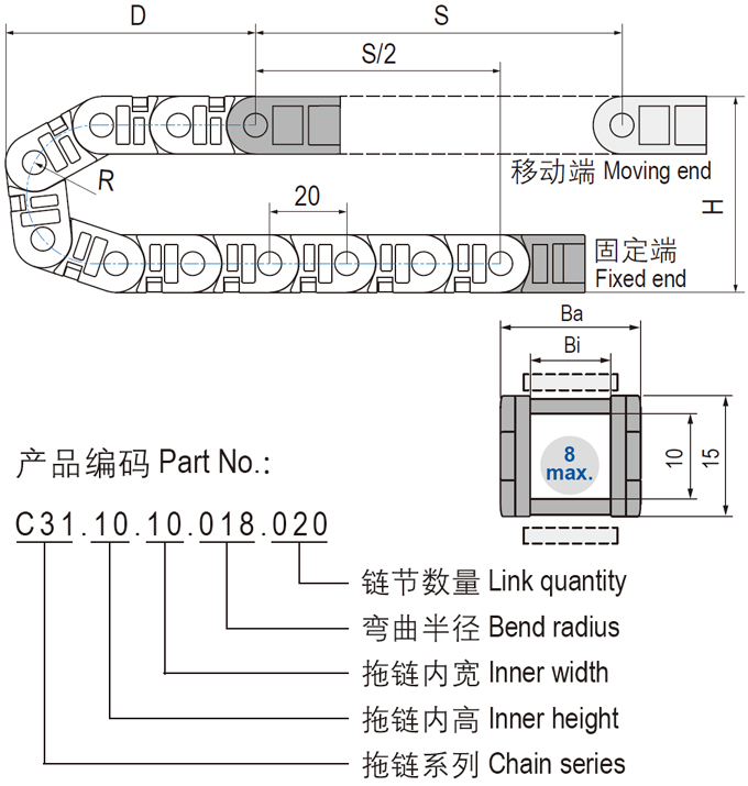 C31.10微型電纜拖鏈可沿內(nèi)側(cè)或外側(cè)打開,堅固耐用和多種打開方式設(shè)計,適用于高速運動。C31.10微型可打開電纜拖鏈適用于較小安裝空間,多種內(nèi)寬規(guī)格可選。