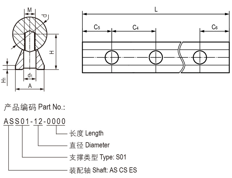 ● 標(biāo)準(zhǔn)設(shè)計(jì)支撐軸;● 可用軸材料:AS精密鋁軸,CS精密硬鉻鋼軸,ES精密304;